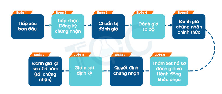 Sau khi doanh nghiệp đã có đủ 02 điều kiện trên, Doanh nghiệp cần lựa chọn tổ chức đánh giá chứng nhận. Việc đánh giá chứng nhận sẽ được thực hiện khi Doanh nghiệp gửi yêu cầu cho tổ chức chứng nhận. Quy trình đánh giá chứng nhận sẽ được thực hiện theo quy định của Tổ chức chứng nhận.